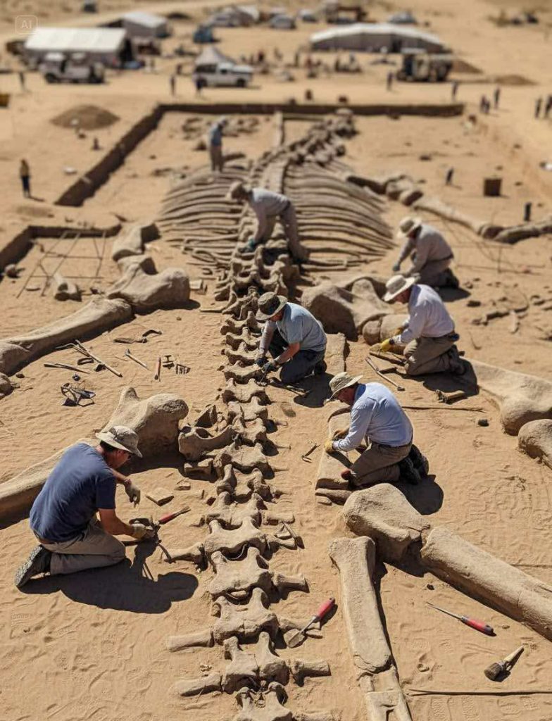 Spalující slunce nemilosrdně pražilo na vyprahlou zemi, když archeologové, vyčerpaní z nekonečných vykopávek, náhle přestali. Jeden ze studentů, oprášující písek, náhle vykřikl. Před nimi se objevil kus obrovské kosti, jako by byl skrytý pod vrstvou času. Během několika minut bylo jasné, že narazili na něco, co se vzpíralo popisu v jakékoli učebnici biologie.