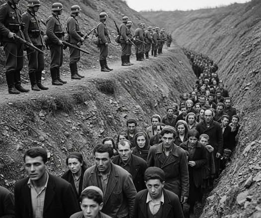 Septembre. La journée avait commencé normalement : l’odeur des pommes mûres, le grincement d’une charrette, les rires des enfants. Mais vers midi, ils furent rassemblés ici. Hommes, femmes, enfants. La poussière se soulevait et se déposait sur leurs visages, les rendant tous semblables. Certains pleuraient, d’autres priaient, d’autres encore restaient silencieux. Quand on leur ordonna de se déshabiller, le ciel s’assombrit, alors même que le soleil était à son zénith.