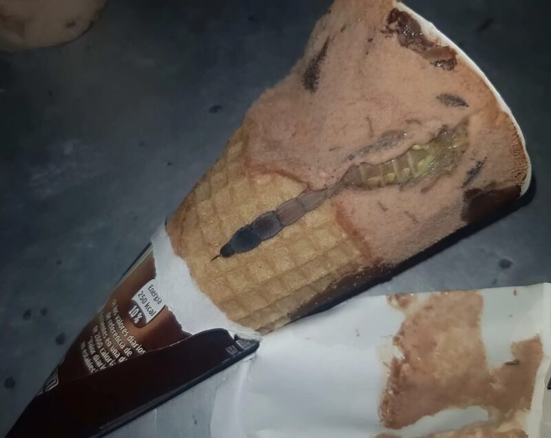 Uvnitř, těsně pod čokoládovou vrstvou, bylo něco tmavého. Ne hladké. Ne sladké. Nezmrzlinové. Nejdřív jsme si myslely, že je to kousek karamelu nebo výrobní chyba. Ale dcera, zvědavá jako vždy, do toho jemně rýpla lžičkou.