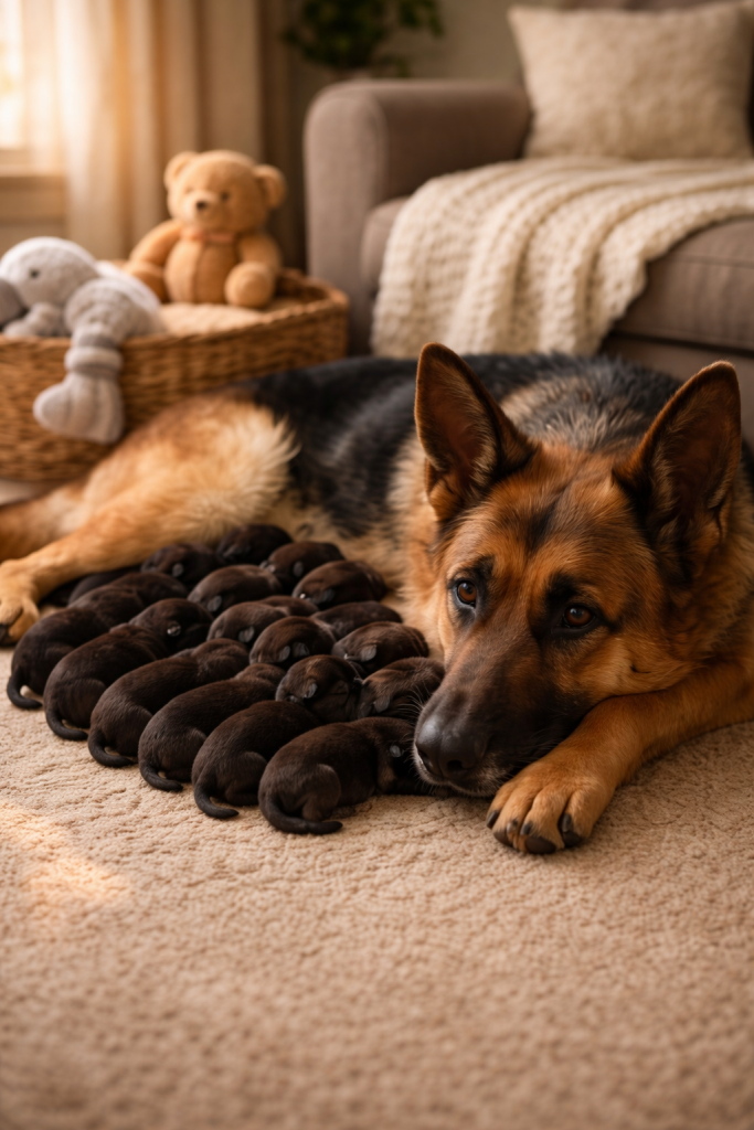 Les rues brillaient sous les lampadaires, désertes, froides. Sur le bas-côté, un gémissement à peine audible perça le bruit de l’averse. Ce n’était pas un simple cri d’animal. C’était un appel.Dans l’herbe détrempée gisait une femelle berger allemand. Amaigrie. Blessée. Sa fourrure collée par la boue et le sang. Elle tremblait, mais ne montrait aucune agressivité. Quand l’homme s’approcha, elle leva les yeux vers lui — des yeux épuisés, suppliants.