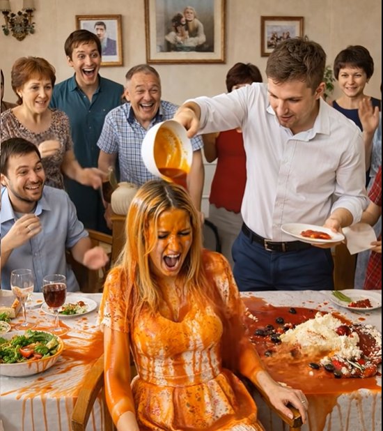 Červená omáčka stékala po jejím obličeji, vsakovala se do šatů, kapala na podlahu. Vlasy se jí přilepily na tváře. Na okamžik ani nechápala, co se stalo.
