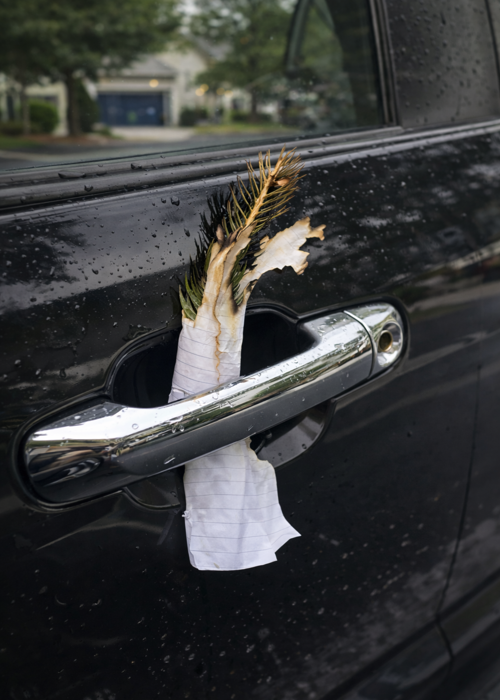 Stalo se to přímo u vchodu do obyčejného bytového domu. Žena přišla ke svému autu jako každý den, ale hned v tu chvíli pochopila, že něco není v pořádku. Z kliky dveří trčela černá, spálená borovicová větev zabalená do zmačkaného papíru. Nebyl to odpad. Nebyla to náhoda. Vypadalo to jako vzkaz.